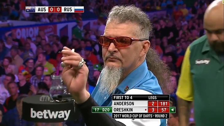 Игру начинали вторые номера команд. Александр Львович вышел играть в дартс, и это у него прекрасно получалось — в первом же леге он мог закрыть 170, сорвав третий дротик по горизонтали. Кайл Андерсон выходил побеждать любой ценой, поэтому нервничал, мучился, но брал леги соперника — впрочем, как и Орешкин. На брейках дело дошло до счёта 2:2, когда Орешкин взял очередной чужой лег, а затем победил на своём начале — 4:2 и 1-0 в серии. Кстати, при наборе 91,54 — прекрасный показатель для любителя!