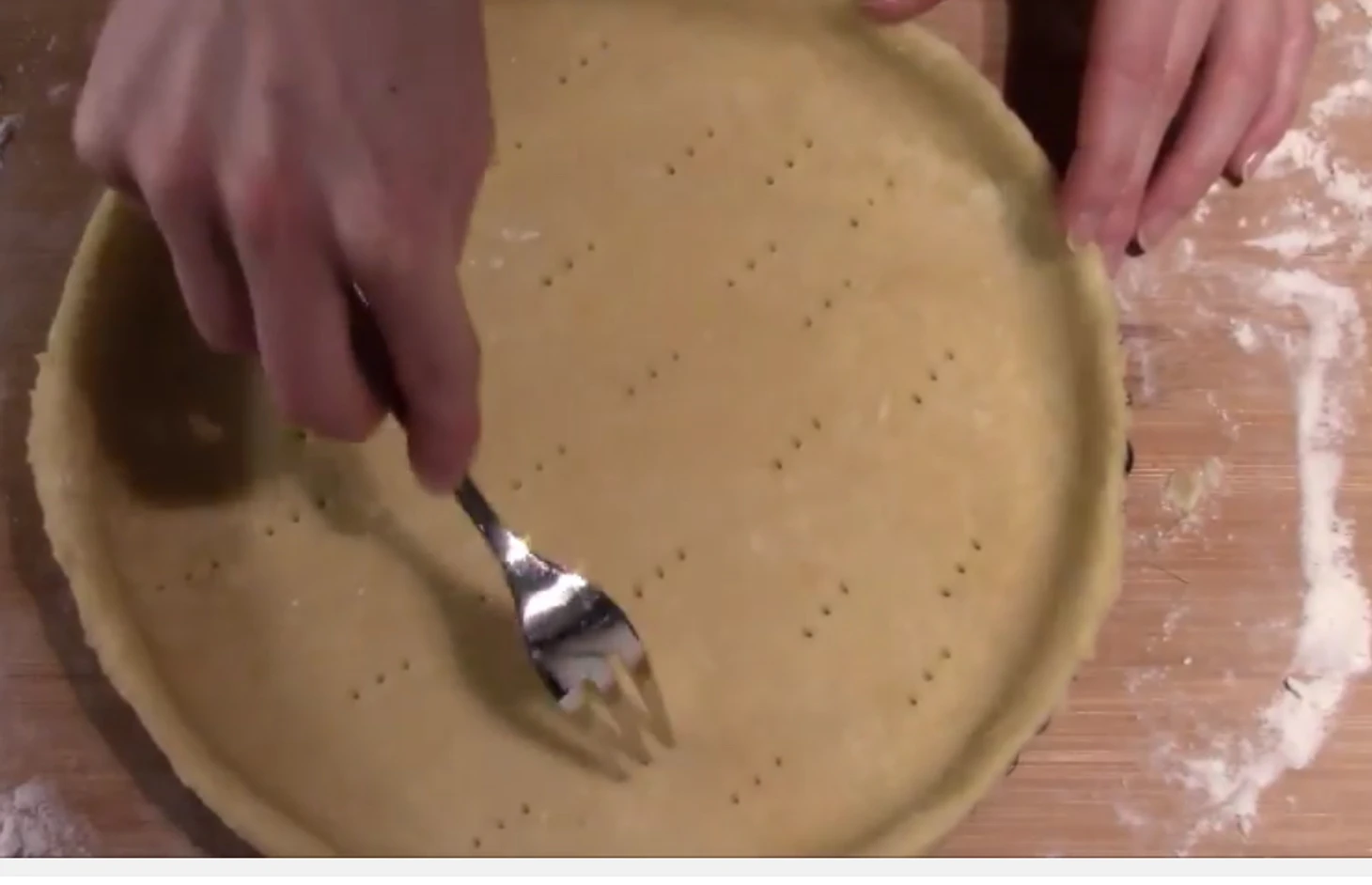 Тесто раскатать в тонкий круглый пласт, размером несколько больше, чем сама форма. Форма для выпечки должна быть тщательно подготовленной, промазана маслом и присыпана мукой, тогда вынуть пирог из формы не составит никакого труда. Укладываем тесто в форму, края должны быть приблизительно на уровне формы, позже лишнее необходимо обрезать. Вилкой протыкаем тесто по всему дну.