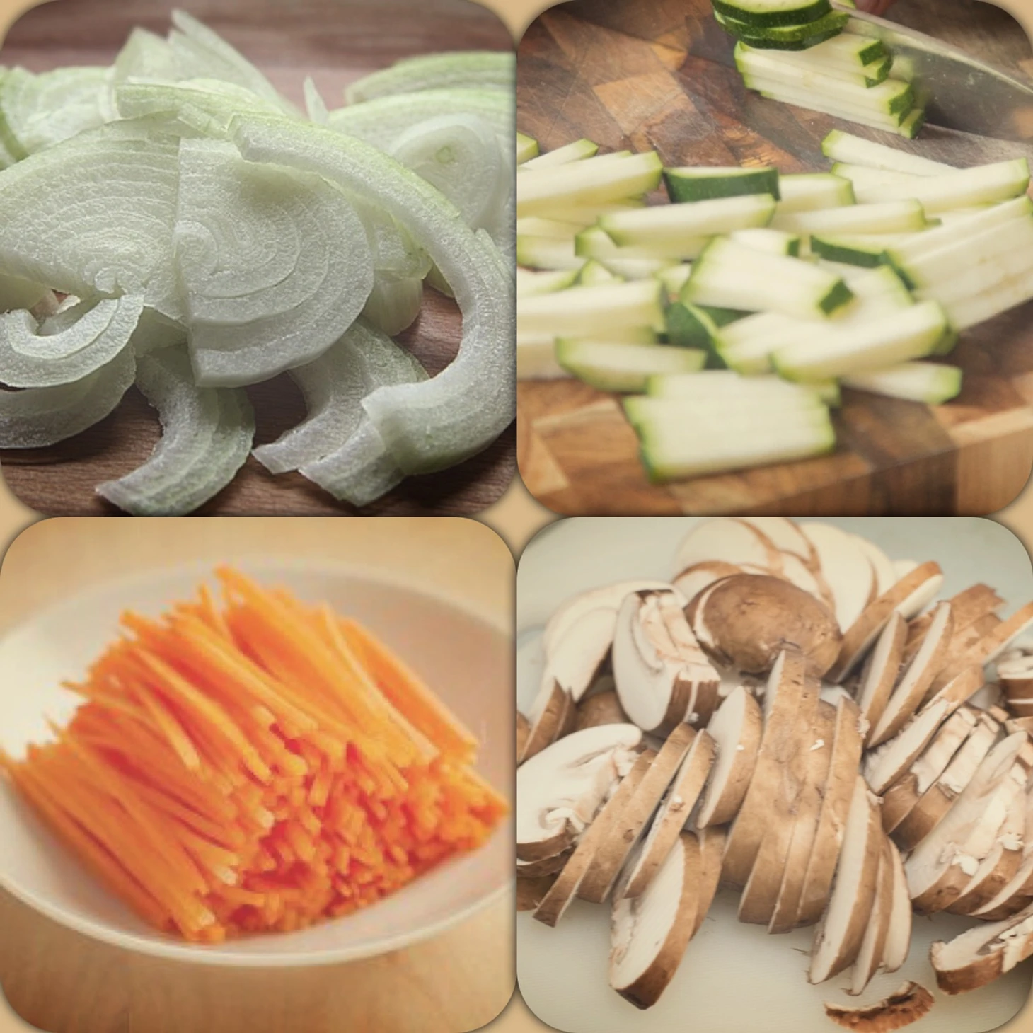1) 1 средний цукини, натереть на крупной терке или нарезать мелкой соломкой.