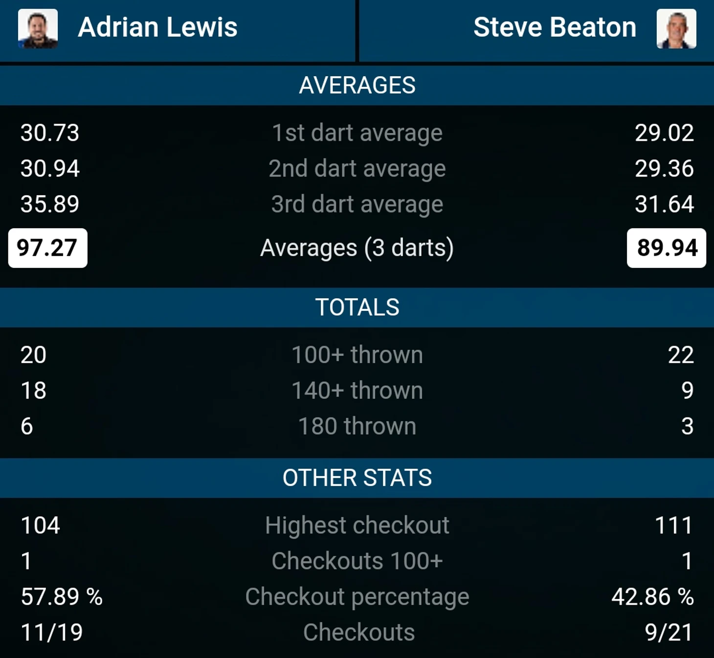 Очень необычный матч получился. Результат закономерен, но сама игра получилась интересной, так как дошла до решающей стадии. При этом, если посмотреть статистику, то трудно сказать чем же смог Битон навязать сопротивлении двукратному чемпиону мира. Конечно, Льюис сейчас далеко не в оптимальной форме, но Стив ничего супер выдающегося даже для себя не показал, хотя неплохо закрывался. Кстати, Льюис в этом матче показал свой самый высокий набор за последние полтора года.