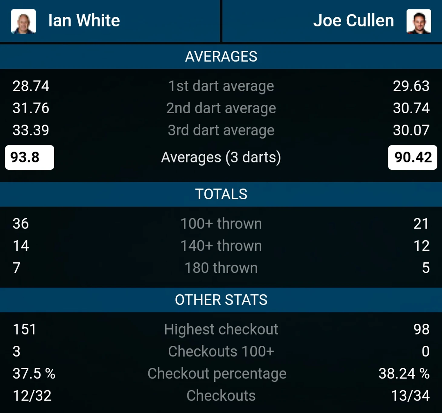 Первый матч на данном турнире, в котором пришлось играть решающий лег. Уайт неплохо закрывался, но в конце немного не хватило сил. Каллен оказался чуть более расторопным на удвоениях.