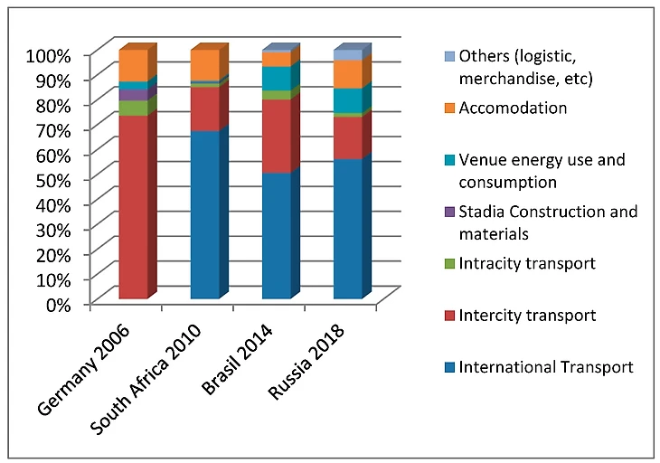 Ниже мы привели данные о распределении эмиссии углекислого газа по сферам среди четырёх чемпионатов мира по футболу. Половина всего СО2 приходится на международные перелёты (international transport). Для ЧМ-2006 в Германии такие подсчёты не проводили. По другим странам отчётливо видно, что самолёты стали главными виновниками загрязнения атмосферы.