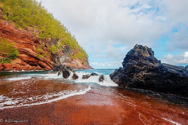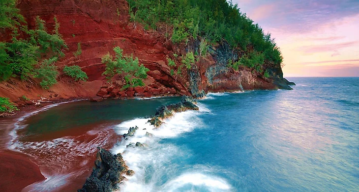 Главной особенностью пляжа Каихалулу, расположенного в одноименной бухте, является песок темно-красного цвета, который создает неповторимый контраст небесно-голубой воде и окружающим побережье тропическим зарослям.