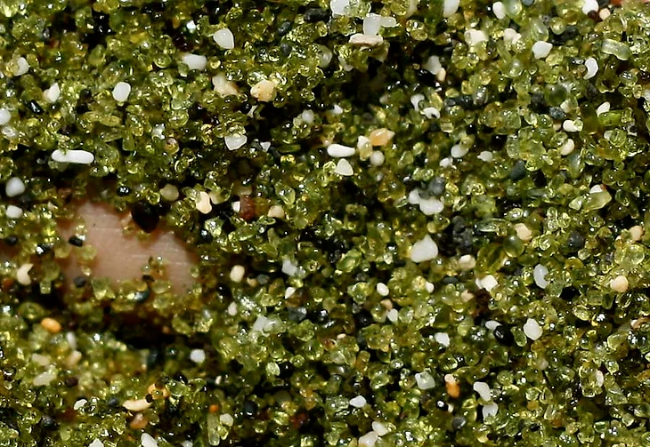 Это объясняется тем, что песчинки пляжа состоят из полудрагоценного камня вулканического происхождения – хризолита (оливина), который имеет красивый золотисто-оливковый цвет. Кристаллы оливина известны еще под названием "гавайские бриллианты".