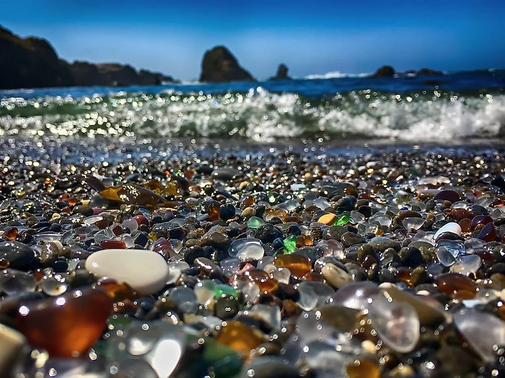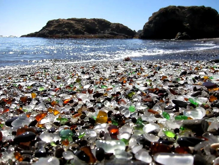 Побережье называют «стеклянным» вовсе не из-за метафорического сходства — оно действительно покрыто миллионами отполированных водой осколков стекла, которые переливаются на солнце всеми цветами радуги.