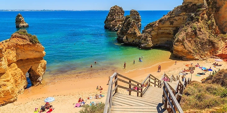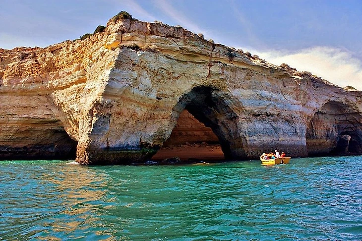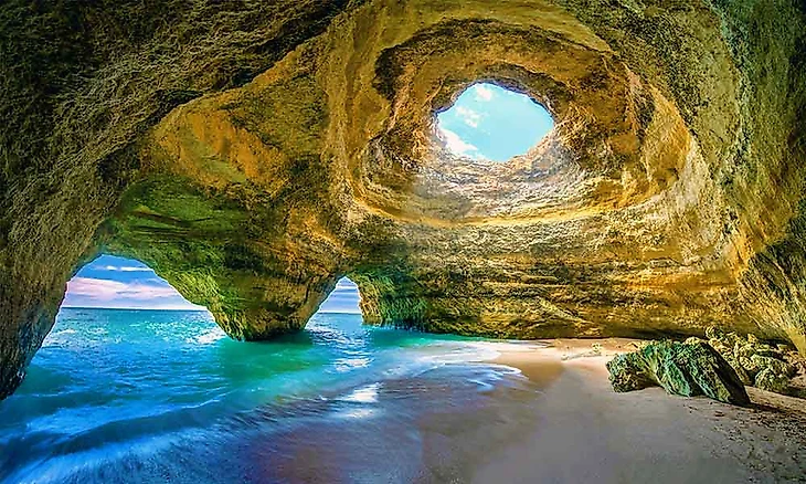 Уединенный пляж в пещере Бенагил — главная достопримечательность побережья Алгарве. Окна грота видны с 50 м высоты прибрежных скал, но спускаться вниз опасным маршрутом не советуют.