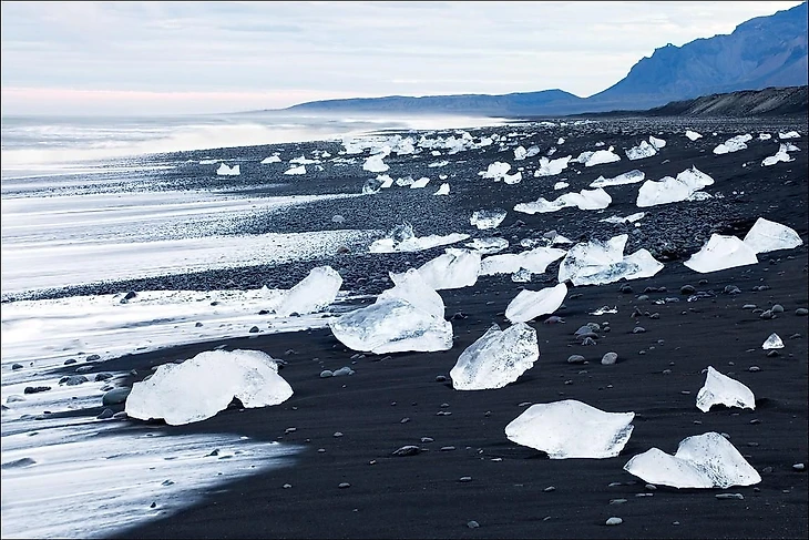 Черный вулканический песок и глыбы льда, которые откололись от самого крупного в Исландии ледника Ватнайекюдль и пристали к берегу, образуют очень красивый контрастный рисунок необычного пляжа Jökulsárlón.