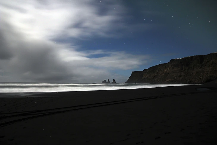 В звездную ночь песок на пляже Вик кажется еще темнее.