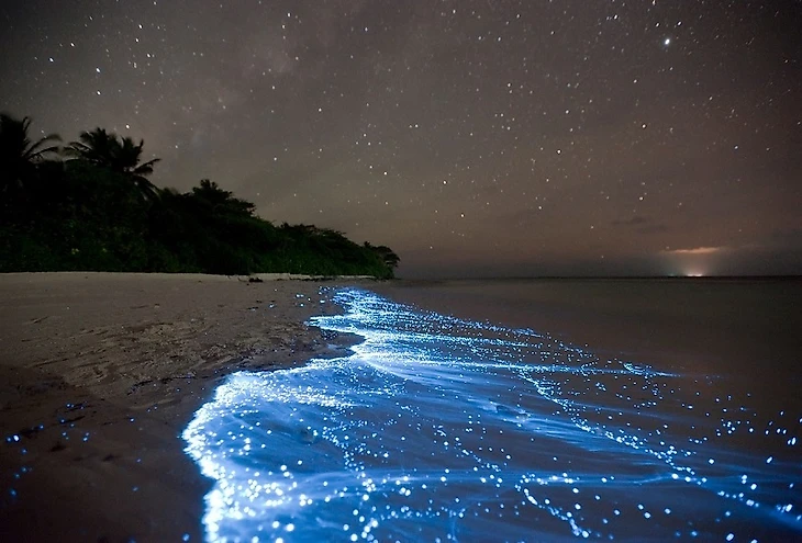С приходом ночи пляжи некоторых островов Мальдивского архипелага вспыхивают миллионами светящихся неоновых точек, словно звездное небо падает на берег Индийского океана.