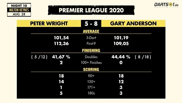 Обоих шотландцев прилично штормит после длительного перерыва. Это наглядно продемонстрировал их матч между друг другом. В начале играть против супер готового Питера было очень трудно, Гари старался, но Райт играл просто здорово. только при счёте 5-2 в пользу Райта Андерсон смог взять лег на чужом начале, а потом произошло невероятное и уже "Летучий шотландец" был не остановим и выиграл шесть легов подряд! По набору игроков это лучшая игра тура.