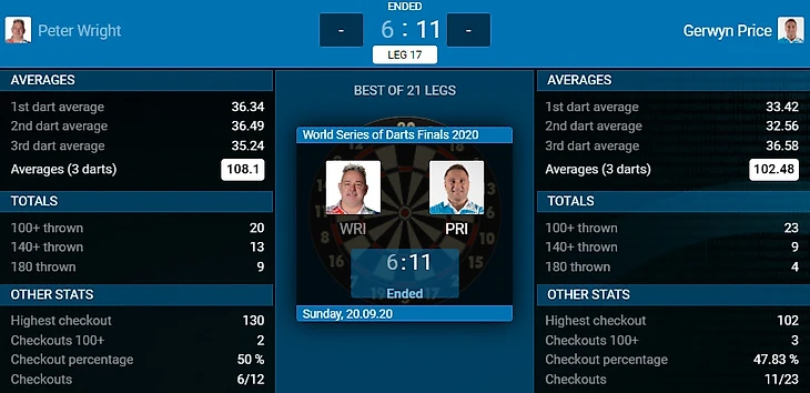 Невероятный матч! Уникальный случай. когда один игрок побеждает по среднему набору на 5+ очков и имеет лучший процент на удвоениях, но всё равно побеждает второй, так ещё и с приличным преимуществом. Как такое получается? Нужно закрываться в очень нужные моменты и выигрывать леги на своём начале, так и сыграл в данном случае Прайс
