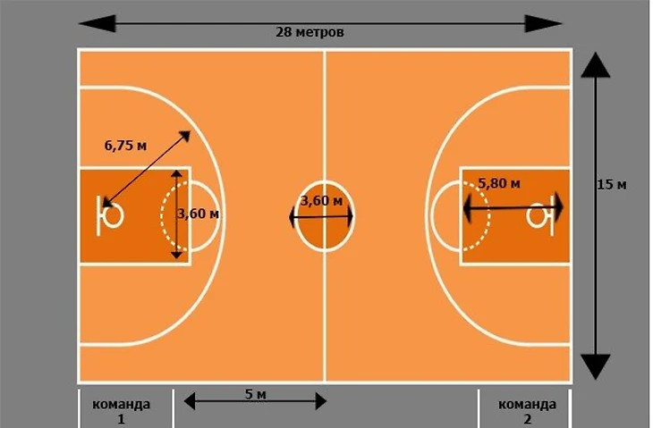3-х очковая или “шестиметровая” — наносится в виде полукруга, высшая точка 7,3 м;