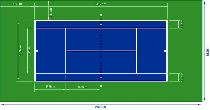 23,77 Х 8,23 или 23,77 Х 10,97 (парный). Ровно пополам корт делит сетка. Она фиксируется на специальных стойках или столбах, закрывая собой все пространство от стойки до стойки. Верхний край фиксируется ремнями, чтобы не провисал в любой точке по длине. Верхняя полоса обязательно белого цвета.