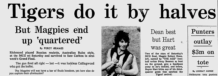 Под конец матча игроки «Коллингвуда» нарушают правила, и думают что судья назначит штрафной удар, защитники команды просто на просто останавливаются, в то время как судья просто на просто молчит, а Кевин Бартлетт подбирает мяч и забивает гол с расстояния 25-ти метров от ворот. Фанаты «тигров» на стадионе просто вне себя от радости.