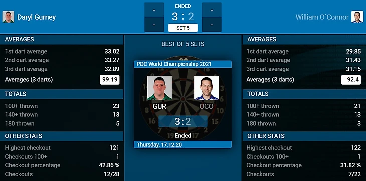 Ещё один упорный матч. Ирландец О'Коннор оказал отчаянное сопротивление против участника Премьер лиги. Гёрни на этот раз был уверен в себе и показал хороший дартс.