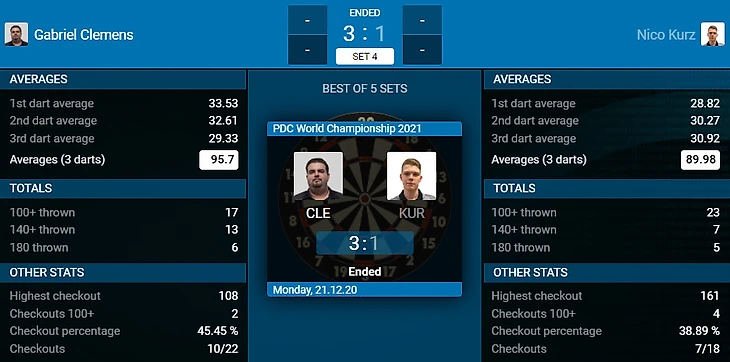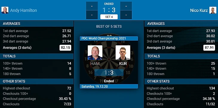 Энди Хамильтон был финалистом чемпионата мира 2012 года, но сейчас после вынужденного возвращения из BDO в PDC явно не показывает близко свой уровень игры, проигрываю перспективному немецкому дартсмену Нико Курцу.