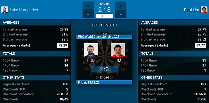 Настоящая легенда дартса. Человек, сыгравший первый идеальный лег на чемпионатах мира. Пол Лим снова удивляет в лучшую сторону, выбивая одного из очень сильных игроков - Люка Хамфриса.