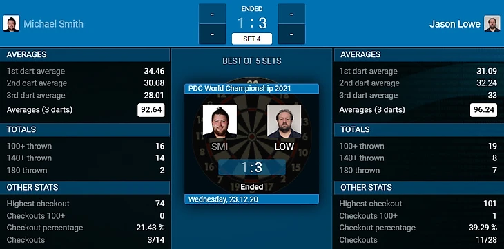 И ещё одна большая сенсация. На этот раз проиграл человек с никнеймом наступающего года. При этом Майкл играл очень нервно и дёргано. Лоу показал неплохой дартс и уверенно закрывал удвоения. После такого "перформанса" от Смита даже обидно за поражение Дмитрия Горбунова. Интересно, как бы он сыграл против такого Смита?