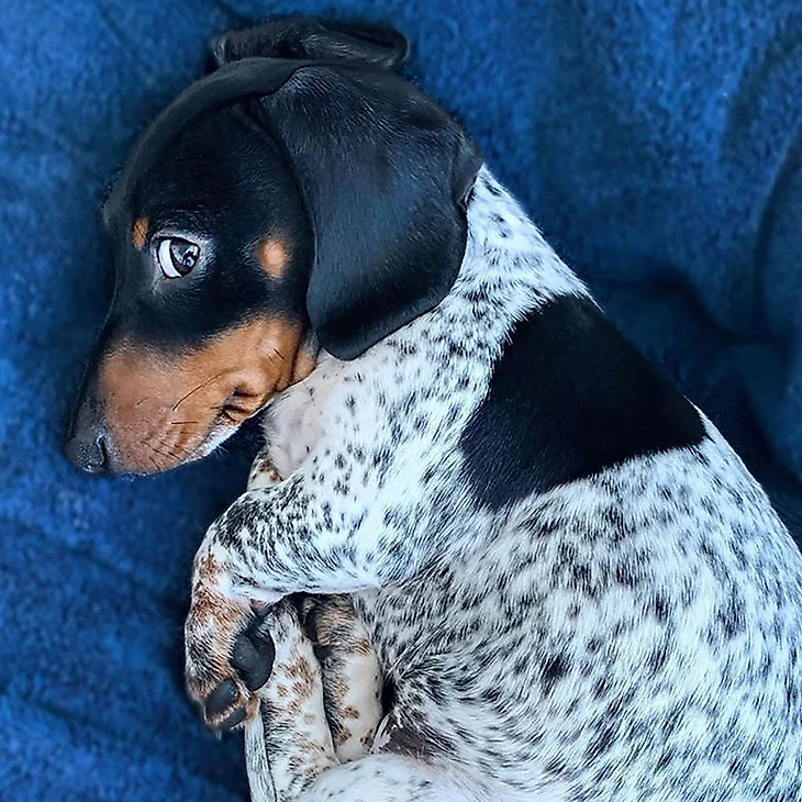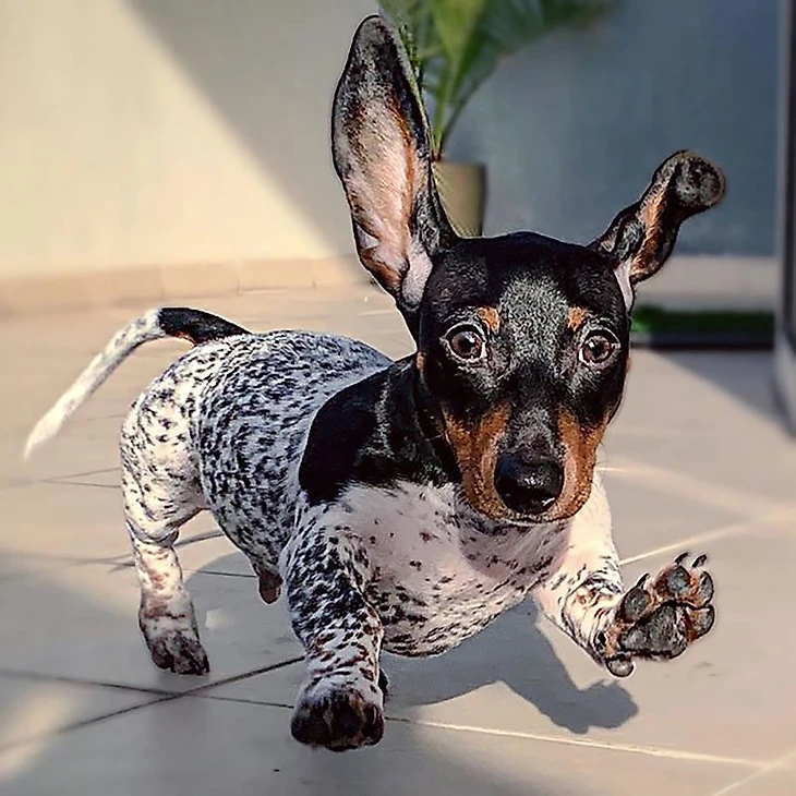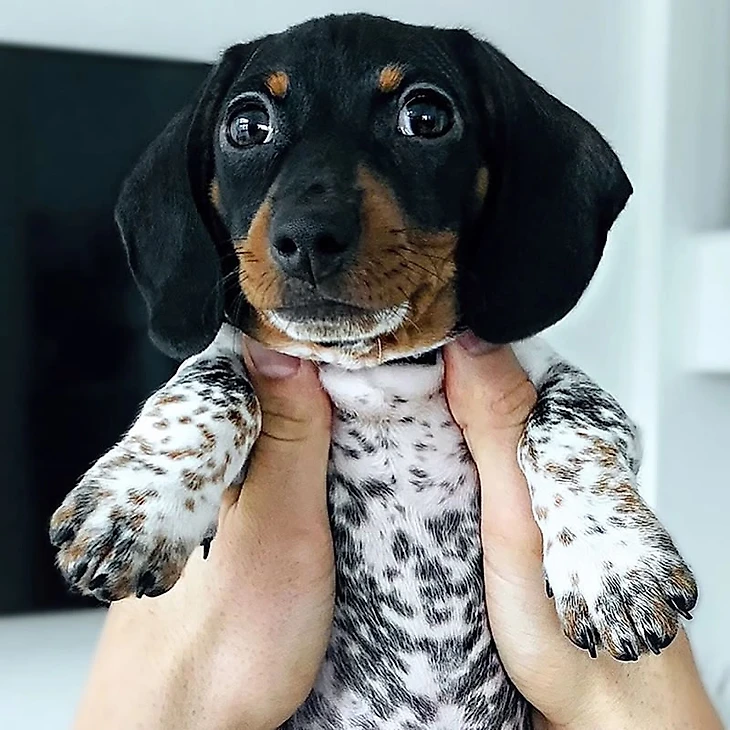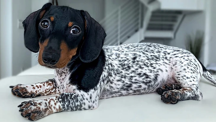Тело семимесячной собаки покрыто белой шерстью, которая усеяна многочисленными тёмными пятнышками, в то время как голова имеет привычную для такс расцветку.