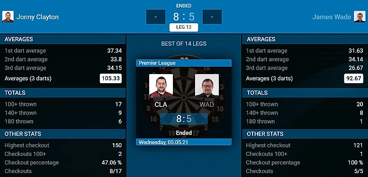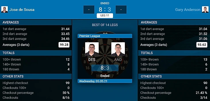 С этого момента игроков осталось восемь. Теперь каждый матч в туре идёт классически до 14 легов, т.е. до победы в 8 легов или ничьи 7-7. Матчей в каждом туре будет лишь четыре