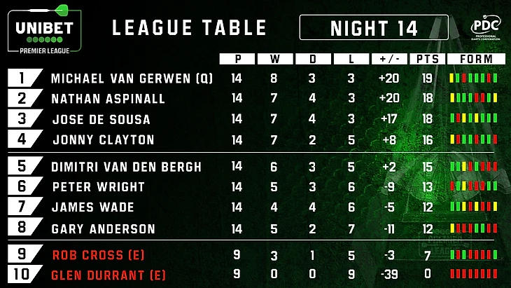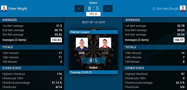 Лучший матч тура. Питеру Райту можно вручать приз зрительских симпатий в этой лиге. Питер полностью провалил прошлую серию из трёх игр, не набрав в них ни одного очка, а сейчас мощно возродился, как птица феникс, двумя волевыми победами. На этот раз был бит прямой конкурент в лице ван ден Берга, который несмотря на очень хороший средний набор, не смог ничего противопоставить очень опытному шотландцу в последних пяти легах встречи