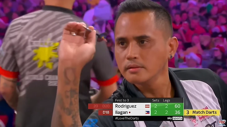 Лоуренс Илаган уже демонстрировал свою конкурентоспособность в этом году на Кубке Мира по дартс, где он в составе команды Филиппин смог забрать целых два лега у маститой пары из Уэльса. На Чемпионате Мира Илаган выступает уже СЕДЬМОЙ раз подряд, но дальше первого раунда пройти не удавалось: уровень филиппинца и постоянных игроков ПДС очень разнится. В этом году Илаган был настроен куда более серьезно и за два стартовых сета отдал Родригесу только два лега. При счете 2:0 в пользу филиппинца, Родригес, судя по всему, все-таки вспомнил о дифирамбах, которые пели ему аналитики по ходу сезона, и полностью забрал два сета (3:1; 3:0), сравняв тем самым счет в матче. В десайдер-сете все дошло до решающего лега, где рука филиппинца не дрогнула, а два дротика в последнем подходе оказались вовсе лишними - удвоение 18 было поражено первым же броском! Илаган прошел во второй раунд впервые в карьере, одолев соперника, который, будем честны, на порядок сильнее его. Австриец, на мой взгляд, просто недооценил соперника, что является главной ошибкой для такого соревновательного вида спорта как дартс.