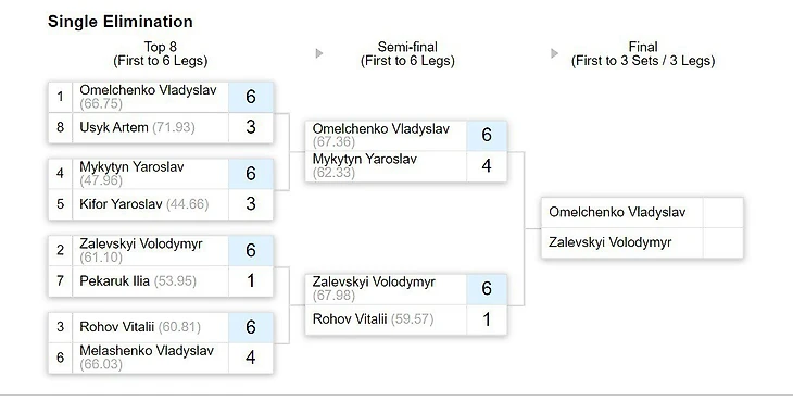 Омельченко без проблем справился со своими соперниками по ходу плей-офф отбора на ЧМ-2023 со средним набором 68.2 (средний набор за три матча плей-офф). Путевка в «Элли-Палли» разыгрывалась следующим образом: четвертьфинал до 6 легов, полуфинал до 6 легов, а финал аж до 3 сетов. В финале Владислав всухую обыграл Владимира Залевского (3-0). Я думаю, что говорить о ничтожности набора и уровня игры в целом на этом отборе глупо, ведь даже самому простому обывателю, который совсем недавно начал следить за международными турнирами, ясен тот факт, что это далеко не тот уровень игры, которого требует главный турнир в году. Вероятно, такую игру спортсменов можно объяснить ситуацией в их стране, которая, логично, сильно влияла на подготовку к турниру.