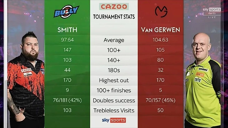 Соперник Смита определялся чуть позже, но его имя можно было предсказать с точностью до одной буквы. Майкл ван Гервен вышел на сцену с желанием уничтожать. Димитри ван ден Берг лупил под 97 очков в наборе, но это не помогло ему зацепить хотя бы один сет. В какой-то момент бельгиец вспомнил, что у него слабая менталка, и поплыл прямо на сцене — несколько раз он стоял и отрешённо смотрел на мишень, прежде чем к ней подойти. МВГ же шпарил как робот, настреляв рекордные для этого ЧМ 108,28.