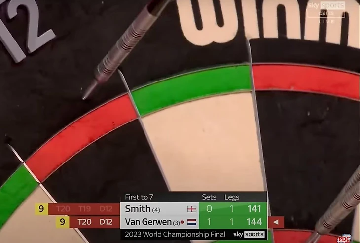 • Ван Гервен был в сантиметрах от идеального лега – но не попал последний бросок и дал возможность случиться легендарному. В дартсе право первого броска – большое преимущество, примерно как своя подача для мужского тенниса. Так что голландец мог просто все сделать сам, и уже не было бы важно остальное, у Смита не оставалось бы шанса догнать. Но после двух попаданий в 60 (маленький красный сектор в створе 20 – утроение) лысый Майкл чуть-чуть не вписался в удвоение 12. Заканчивать нужно именно удвоением (или попаданием в булл – самый центр мишени, это 50 очков), дабл-12 на топ-уровне используют весьма часто, но Ван Гервен не смог.