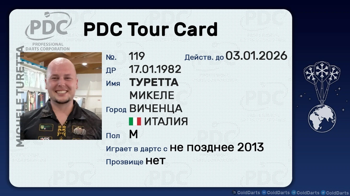 Ещё более неожиданным выглядит взлёт итальянца Микеле Туретты. Раньше он светился в PDC как участник Кубка мира и не более того. В Италии есть более известные дартсмены — например, Франческо Раскини, Сержио Крассен, Аврора Фочесато или усатый художник из «Формулы-1» Массимо Данте. Но фартануло Туретте: именно он теперь является полноценным дартс-профессионалом!