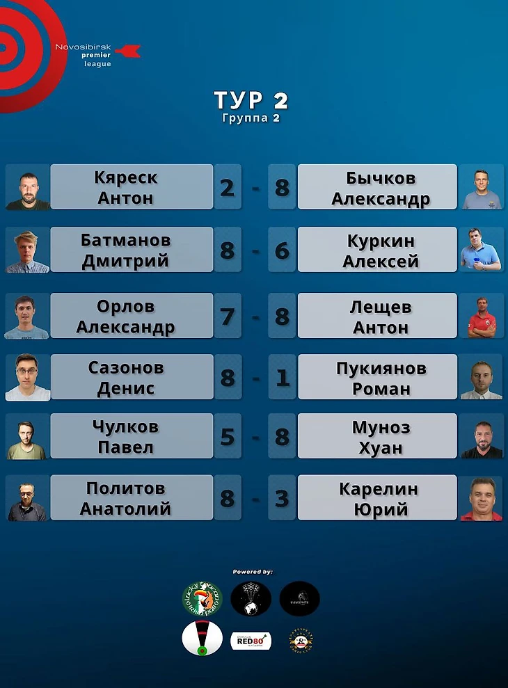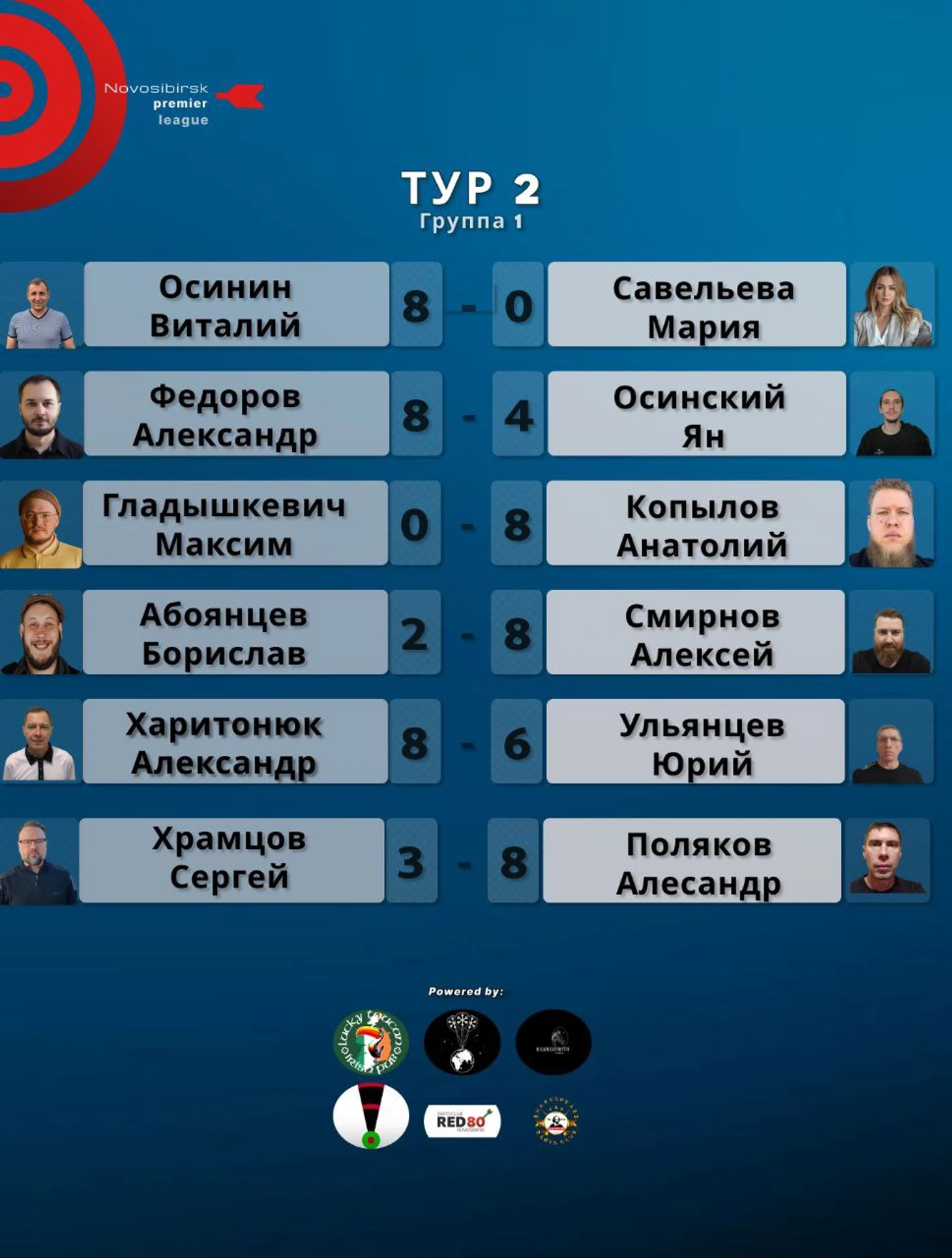 Группа 1 В группе 1 случились две «сухих» победы, обе - разумеется, на счету признанных топов Новосибирского дартса Виталия Осинина и Анатолия Копылова. Игроки держат свой уровень с любыми соперниками и в любых локациях. Очень упорный матч выдался у Александра Харитонюка и Юрия Ульянцева, что, собственно, и прогнозировалось.