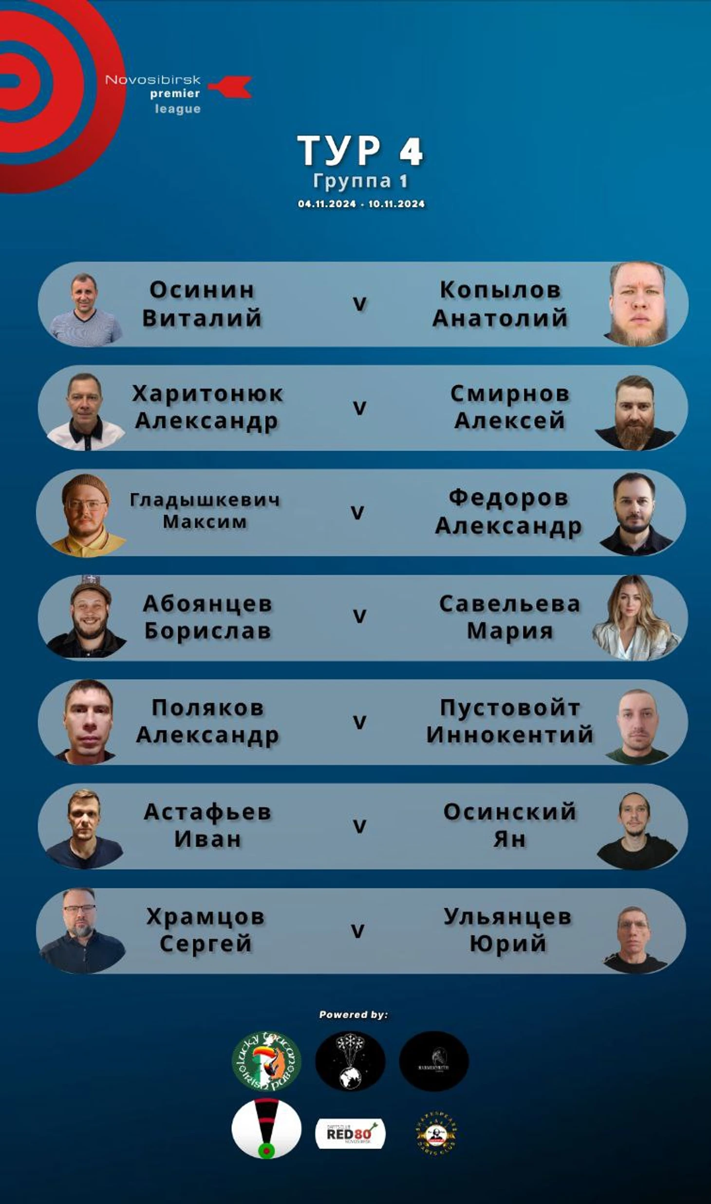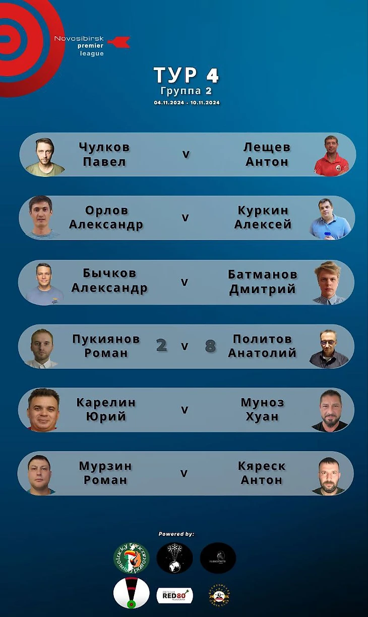 Группа 1 В Группе 1 состоялся матч лидеров Дартс-клуба «Новосибирск» Виталия Осинина и Александра Полякова - дартсмены часто разыгрывают финалы в Ночной Лиге и прекрасно друг друга знают у мишени. В Премьер-Лиге Виталий одержал уверенную победу со счётом 8:3. Очень «горячий» матч случился между Александром Фёдоровым и Алексеем Смирновым: Александр долго лидировал и возможная победа была уже так близка, но Алексей решительным финишным рывком всё-таки подтвердил статус одного из фаворитов группы и забрал победу со счётом 8:6. «Плотных» матчей было вообще много в этом туре - ещё два завершились со счётом 8:6 и украшением стала битва до «десайдера» между Иваном Астафьевым и Юрием Ульянцевым.