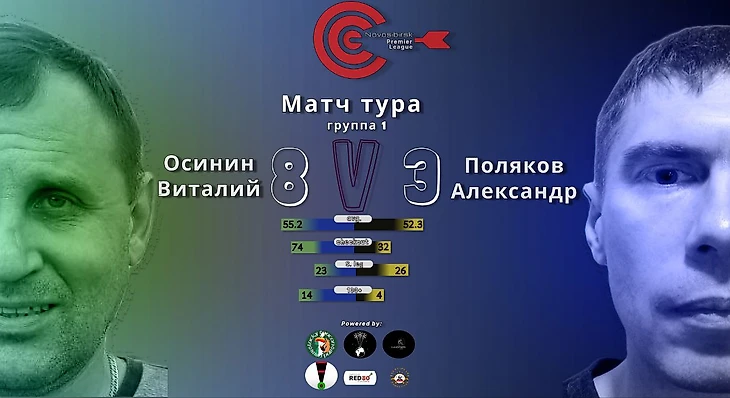 Матч тура: Виталий Осинин против Анатолия Копылова Нам предстоит увидеть отличный матч, на кону стоит бонус в 800 руб. за победу над Виталием. Анатолий может продемонстрировать игру с набором выше 60 - справится ли с этим Виталий? Оба дартсмена идут без поражений, но особо сложных матчей у них ещё не было. Ожидается больше 30 подходов га 100+.