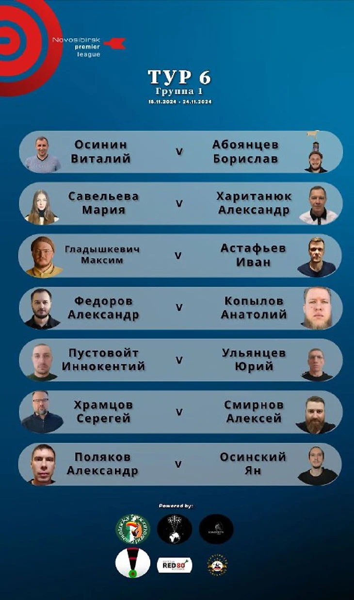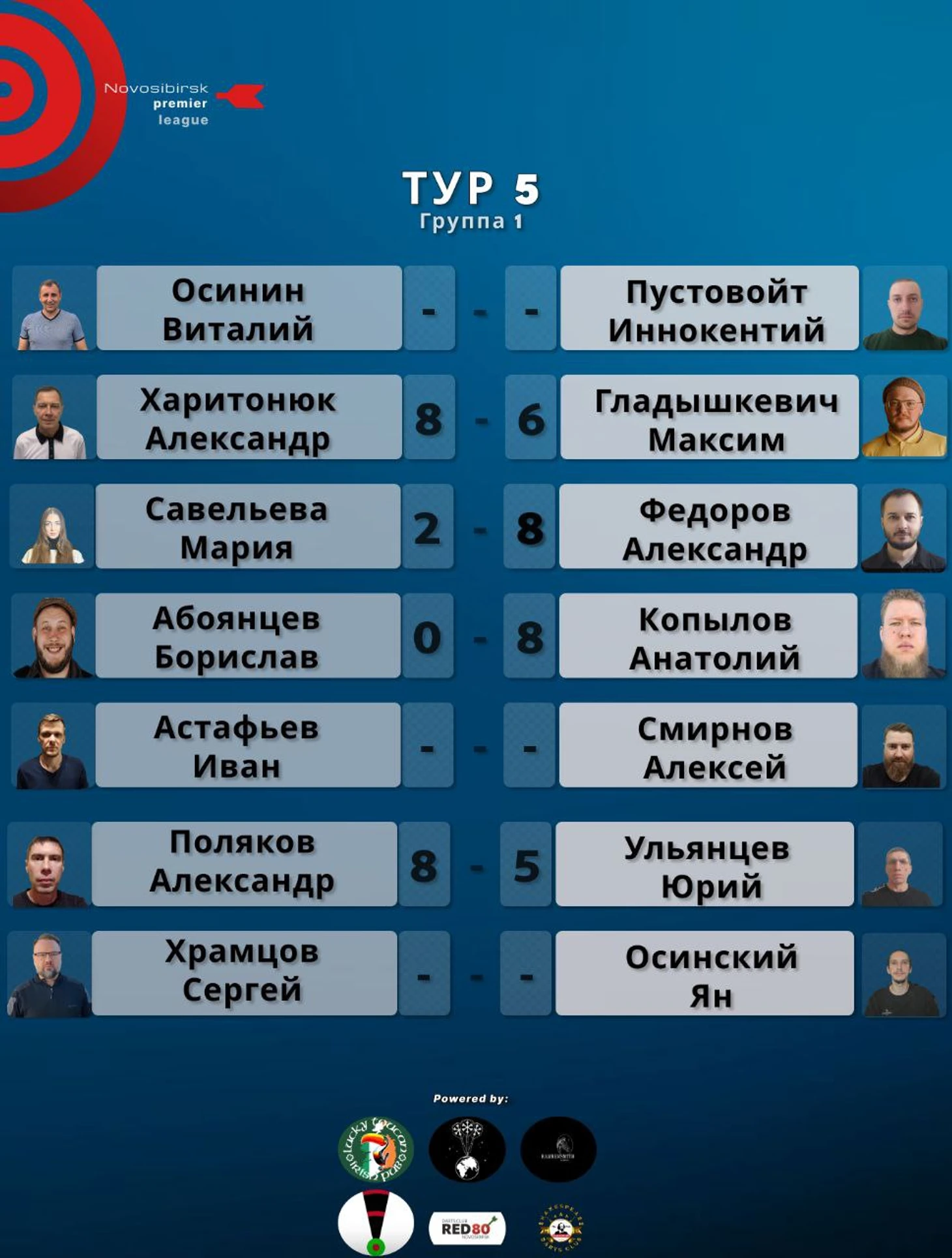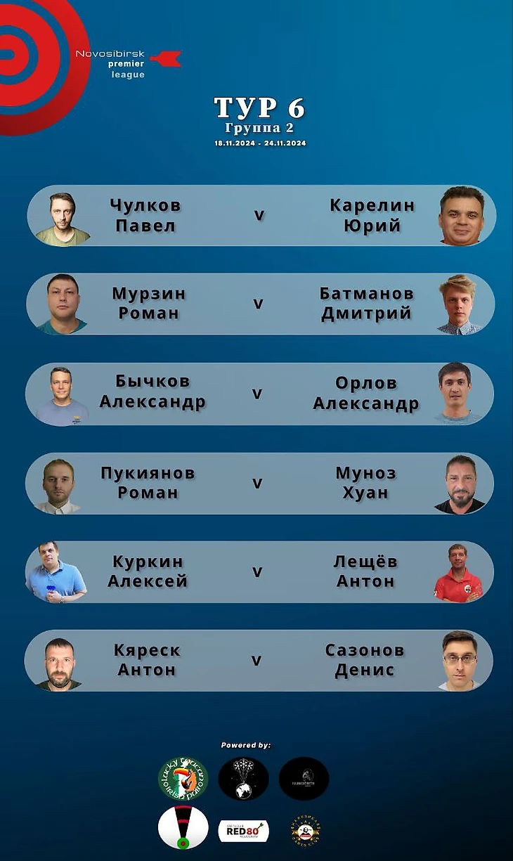 МАТЧ ТУРА Максим Гладышкевич против Ивана Астафьева Классическое противостояние игроков. В первом сезоне одержал победу Иван, но Максим заряжен на реванш и начинает ускоренно тренироваться. Оба дартсмена пока идут в нижней части таблицы, но у Ивана две игры в запасе, а победа над Максимом поможет ему закрепится в зоне плей-офф. Максиму тоже нужна победа чтоб поднять боевой дух и почувствовать уверенность. Мария Савельева против Александра Харитонюка Обоим игрокам нужна победа - Александру чтобы подняться выше в таблице, Марии чтобы наконец выплыть из Чемпионшипа. Виталий Осинин против Борислава Абоянцева Второе место в группе против пока последнего - тяжёлая игра будет у Борислава. Надеемся что он покажет свою лучшую игру. Александр Фёдоров против Анатолия Копылова Встречаются текущие первое и третье места группы. Анатолий в хорошей форме и идёт пока без поражений, Александр проиграл только Алексею Смирнову. Должен получится отличный матч в напряжённой борьбе. Иннокентий Пустовойт против Юрия Ульянцева Оба игрока пока остаются без побед, но в этой игре все-таки кто-то её одержит. Юрий показал хорошие два матча, но не везло на даблах. Теперь будет больше возможности попытаться забрать лег. Александр Поляков против Яна Осинского Александр в хорошей форме и «накидывает» много наборов 100+, а Ян вернулся с отдыха и возобновляет игры. Сергей Храмцов против Алексея Смирнова По личным причинам Алексей пока не имеет возможности играть и матч будет перенесён.