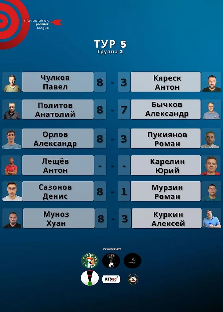 Группа 2 В смежной группе интересных событий было немного больше. Случились три ожидаемые победы фаворитов: Павел Чулков был сильнее Антона Кяреска со счётом 8:3, Хуан Муноз переиграл Алексея Куркина с тем же счётом, а Александр Орлов отдал только те же три лега Роману Пукиянову. Неожиданно крупный счёт был зафиксирован в матче Дениса Сазонова и Романа Мурзина. Роман показал практически такой же высокий набор, как и соперник, но Денису как будто неожиданно «воздалось» за все незакрытые за пару-тройку прошедших недель «даблы». Самый же «огненный» матч был у Анатолия Политова и Александра Бычкова. Александр начинал его фаворитом, но Анатолий не поддался давлению. До счёта 3:3 никто не мог оторваться, но затем Анатолий смог взять два лега подряд. Александр ответил на это тремя своими и повёл 6:5. Анатолий забирает следующий лег - 6:6. Следующий за Александром - 7:6. Анатолий с трудом, но закрывается в мучительно долгом четырнадцатом леге и соперники следуют в «десайдер». Там Александр постоянно немного впереди соперника, да ещё и Анатолий делает «перебор» на остатке 123! Но даже после такой неудачи не опускает руки, набирает 84 очка в следующем подходе и затем закрывает остаток 39 двумя дротиками!