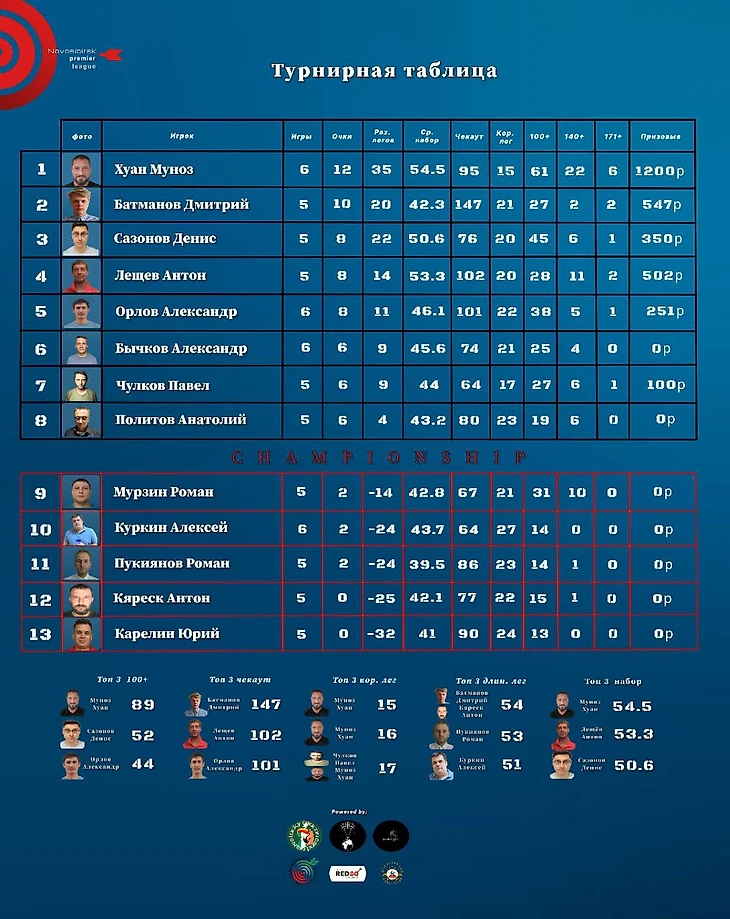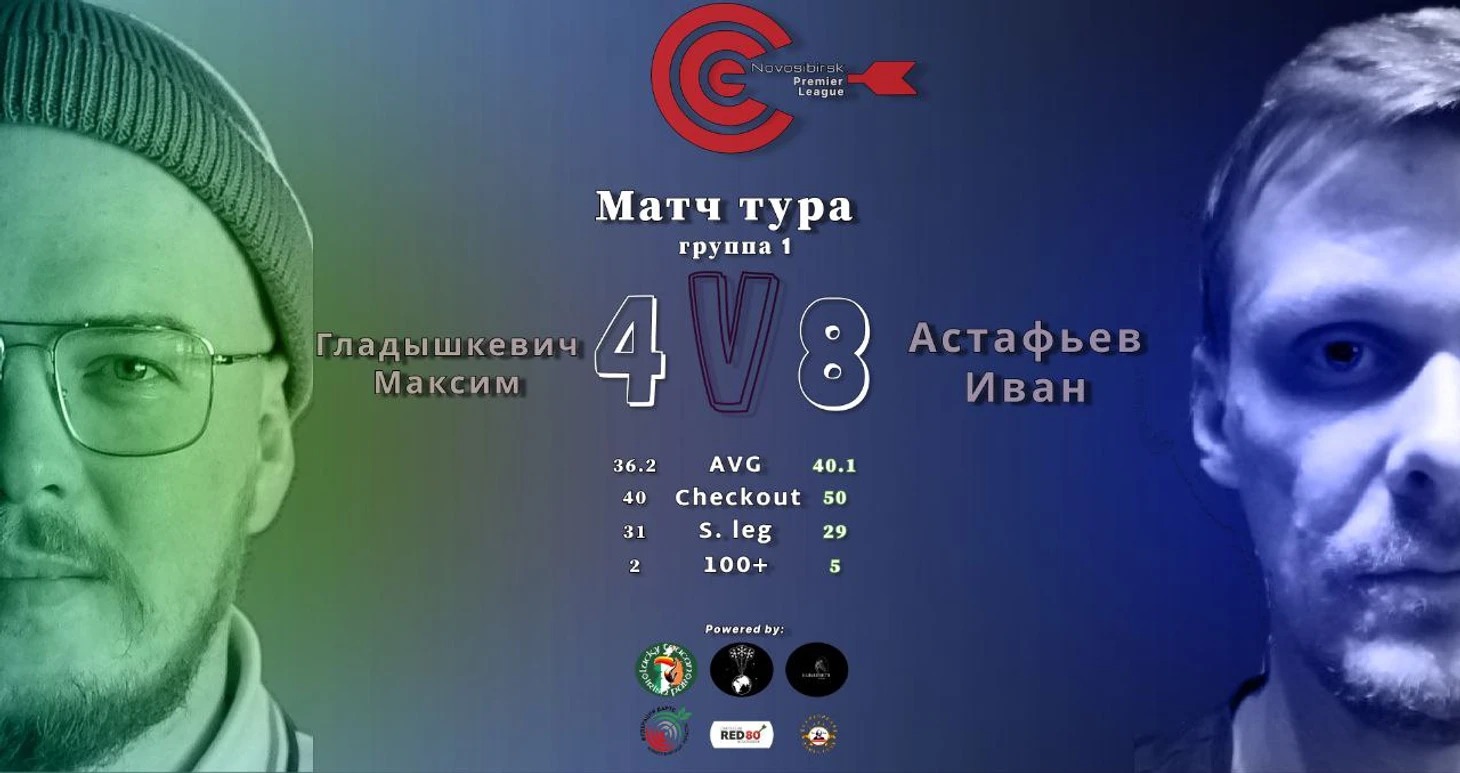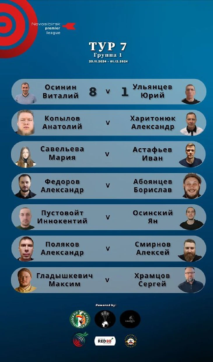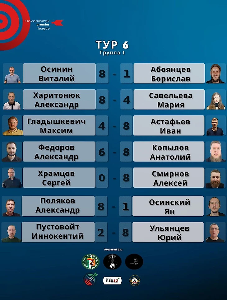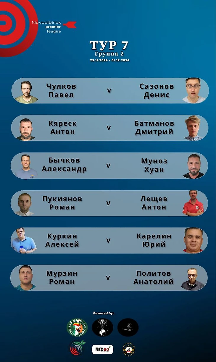 МАТЧ ТУРА Павел Чулков против Дениса Сазонова Денис сейчас выглядит в лучшей своей форме: играя год со средним набором 47, теперь сделал скачок до 50 в среднем. Павлу предстоит противостоять большому количеству «соток» и высокому набору. Хорошо если будут залетать «даблы» и мы увидим хороший набор и плотный матч. Антон Кяреск против Дмитрия Батманова Антон будет биться против Дмитрия, который пока идёт без поражений и находится на втором месте в группе. Антон наоборот идёт без побед и расположен на втором месте, но только с конца. Намечается битва вторых мест Александр Бычков против Хуана Муноза Александру придётся играть выше своего уровня чтобы справится с напором сибирского испанца, и остановить его беспроигрышную серию. Матч скорее всего будет сыгран на выезде в г. Кемерово. Роман Пукиянов против Антона Лещева Очередной тяжелый матч для Романа, но с ними он получает отличный опыт игры в дартс. Алексей Куркин против Юрия Карелина Очень важный матч для обоих соперников - нужно исправлять свое плачевное положение в таблице. Матч мог быть по накалу и важности победы матчем тура, но набрал мало голосов. Пожелаем хорошего набора и быстрых «даблов». Роман Мурзин против Анатолия Политова Роман пока одержал одну победу в рамках Премьер-Лиги, что очень удивительно с его уровнем игры. На этот раз он попытается обыграть Анатолия, который регулярно выдает в последнее время хорошие матчи.
