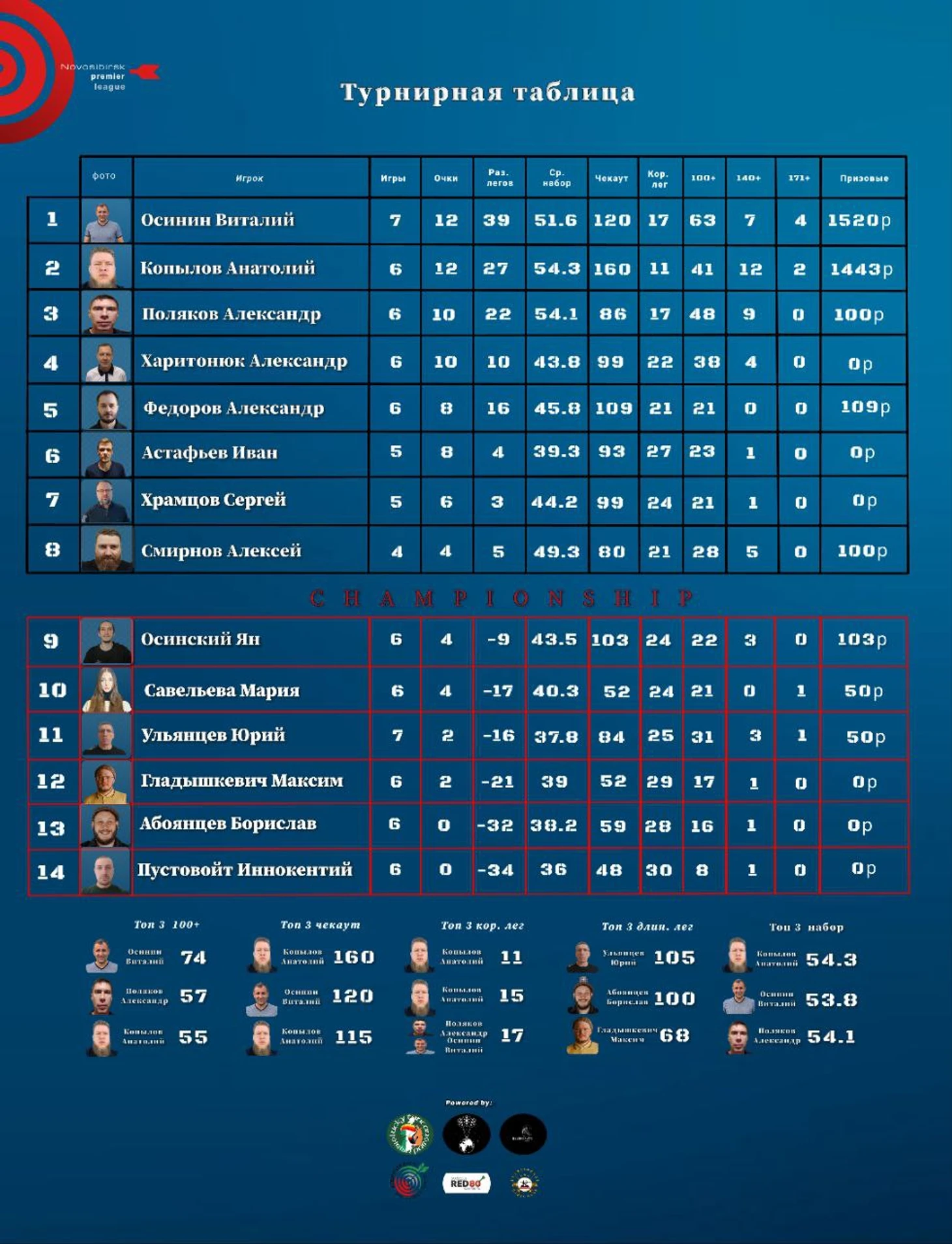 Группа 1 Здесь уже чётко оформилась пара лидеров - Анатолий Копылов и Виталий Осинин шествуют по групповому турниру, подавляя конкурентов высоким набором и уверенными закрытиями. Они же на пару сотворили матч, претендующий на звание лучшего в этом сезона Премьер-Лиги, о чём мы уже подробно рассказывали ранее. Готовы составить им конкуренцию Александр Поляков и Александр Харитонюк, но без побед в личных встречах рассчитывать на успех им не приходится. Уверенно чувствуют себя в верхней части таблицы Александр Фёдоров и Иван Астафьев, для них сейчас главное - забирать «свои» матчи. Видеть Алексея Смирнова на восьмом месте было бы очень удивительно, если не знать его кредо «настоящая игра - только в плей-офф», да и игр он провёл меньше всех.