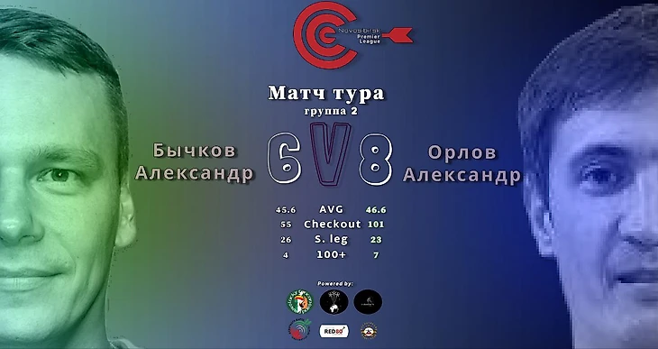 Группа 2 В смежной группе лидеры также продемонстрировали серьёзный настрой: Павел Чулков, Хуан Муноз и Антон Лещёв не дали больших шансов соперникам. На куда большее количество победных легов имел право рассчитывать Антон Кяреск во встрече с Денисом Сазоновым, но у Дениса снова случился прорыв в завершениях в матче Лиги после проблем с ними же в туре NDZone накануне. Конкурентную борьбу устроили в своей встрече Роман Мурзин и Дмитрий Батманов - Романа чуть=-чуть не хватило на финальные леги и Дмитрий смог сделать отрыв и удержать его до победы. Ну и отличным вышел матч тура - игра двух Александров: Орлова и Бычкова. Вначале соперники шли ровно, забирая по легу друг у друга до равенства 2:2. После этого Александру Бычкову удался мощный рывок в три победных лега. Александр Орлов ответил на это абсолютно симметрично и сравнял счёт - 5:5. Затем игроки опять обменялись легами, а прорыв случился в тринадцатом - Александр Орлов «включил» набор 60+ и с большим отрывом вышел вперёд - 7:6. Следующий лег стал последним, дартсмены ударно «стояли» на закрытии даблов двойки и единицы и перебороть себя первым смог Александр Орлов.