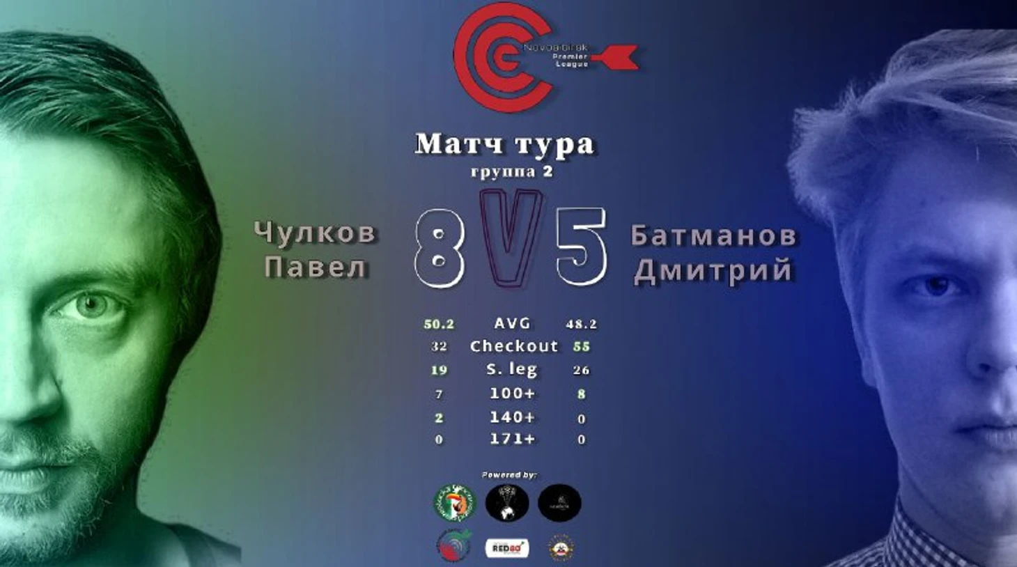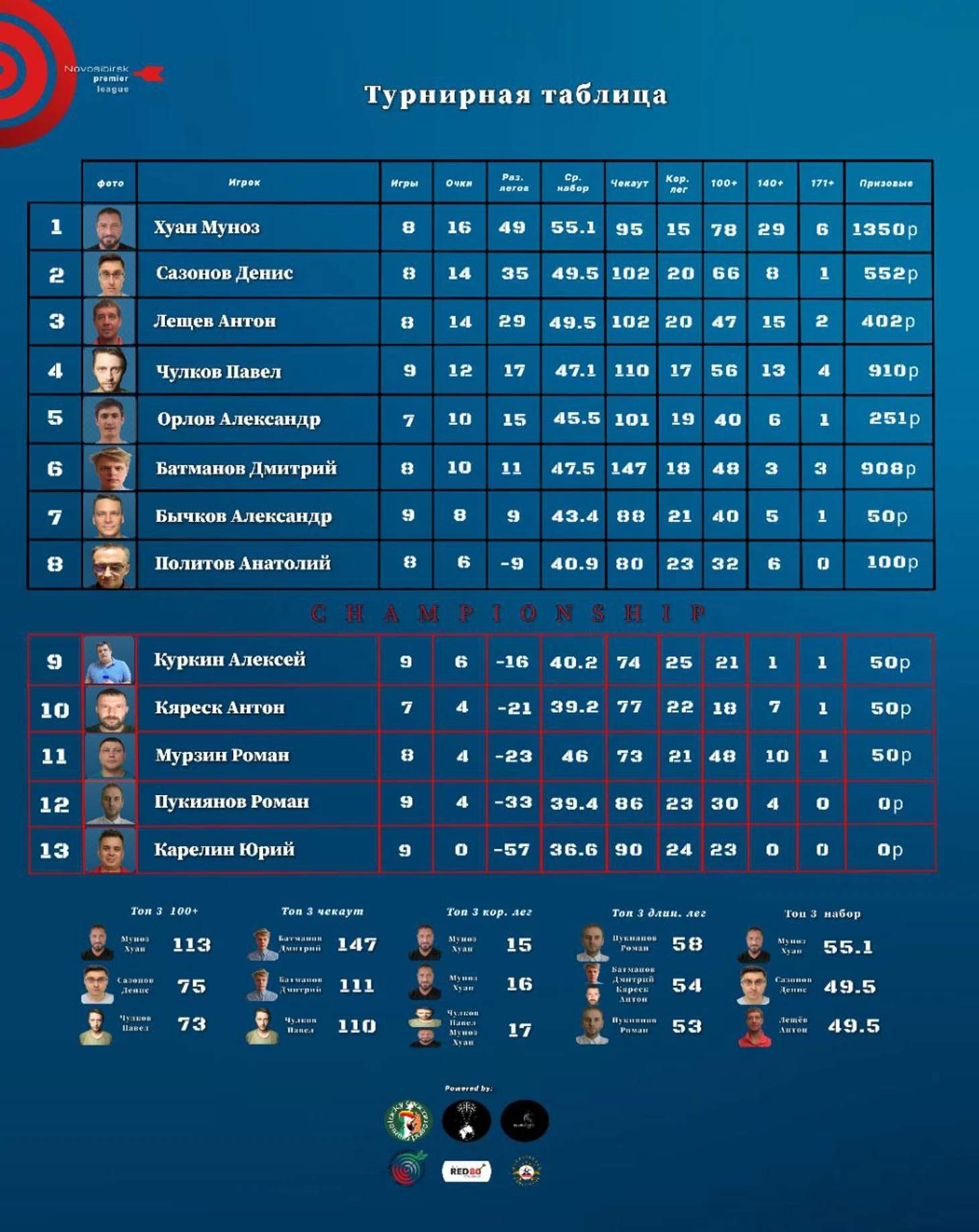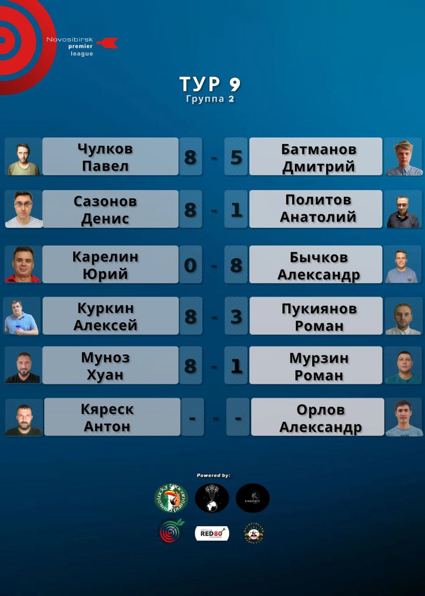Группа 2 Здесь также был перенесён один матч, а лидеры постарались упрочить свои позиции. Денис Сазонов забрал победу у Анатолия Политова со счётом 8:1, также как и Хуан Муноз в игре с Романом Мурзиным. Александр Бычков хорошо улучшил себе разницу легов «сухой» победой над Юрием Карелиным, а в противостоянии рвущихся в плей-офф Алексея Куркина и Романа Пукиянова лучше был Алексей со счётом 8:3.