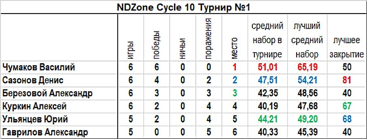 Статистические итоги первого турнира десятого цикла NDZone 🎯 Первое место - Чумаков Василий 🥇 Второе место - Сазонов Денис 🥈 Третье место - Березовой Александр 🥉 Самое большое закрытие - Сазонов Денис (81) Лучший средний набор в одной игре - Чумаков Василий (65,19) Лучший средний набор в турнире - Чумаков Василий (51,01) Самый результативный матч турнира - игра группового этапа Чумаков Василий - Денис Сазонов (суммарный средний набор 65,19+54,21=119,40)
