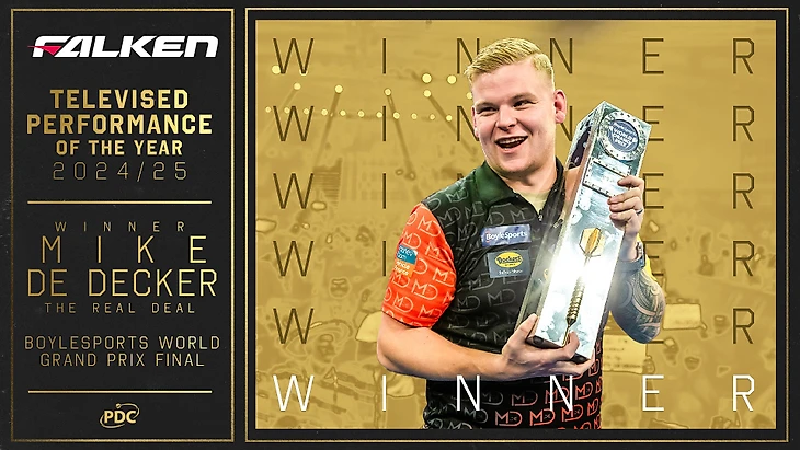 Номинация «Лучший перформанс» присуждается за самый яркий матч сезона. Организаторы решили отметить победу Майка де Декера в финале Гран-при. Тут при желании можно поспорить. Но, в принципе, успех вчерашнего ноунейма, который обыграл на тот момент действующего чемпиона мира Люка Хамфриса, оценен по достоинству.