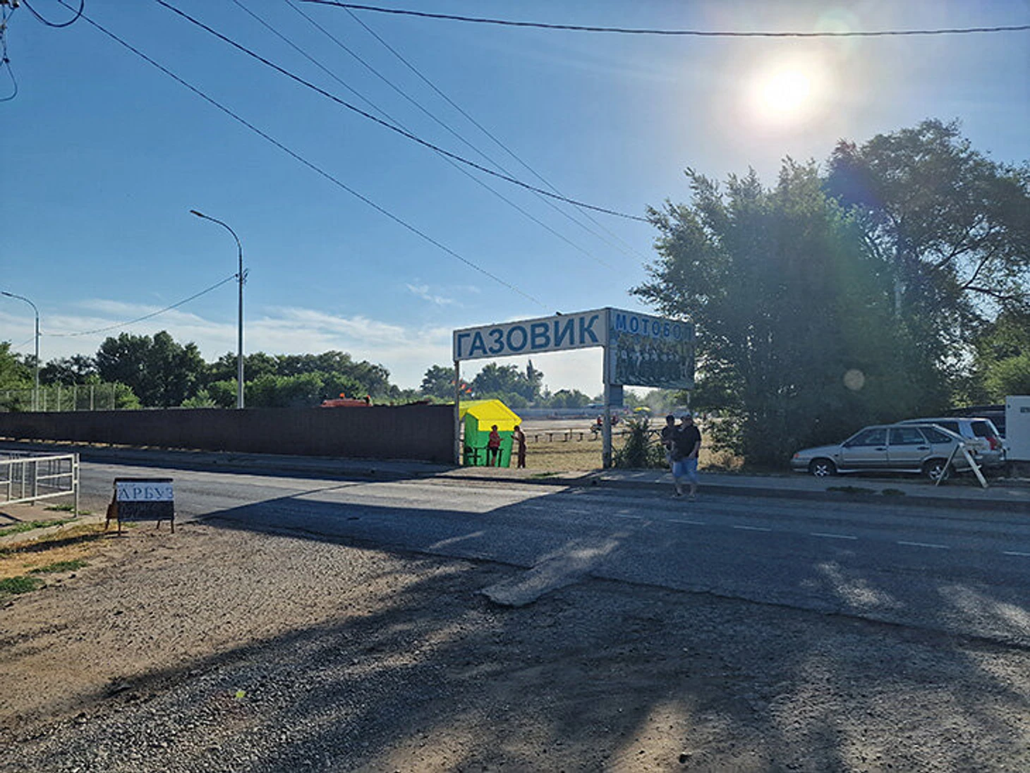 Мотодром «Газовик», в отличие от местного футбольного коллеги, — это торжество олдскула. Он словно бы пришел из эпохи, когда мотобол в этих местах только зарождался. Гаревое поле, вдоль одной из длинных сторон — трибуна с тремя рядами деревянных скамеек. Вдоль другой — просто отдельные скамейки, трибуной это назвать нельзя. Табло нет — ни цифрового, ни аналогового, никакого. Вход — просто ворота с вывеской «Газовик». У входа располагается палатка, возможно, это касса или что-то подобное, но когда я проходил мимо, там никого не было, хотя потом я уже изнутри стадиона видел, что в палатке появилась женщина, и входящие на стадион мужчины подходили к ней и о чем-то разговаривали. Возможно, они покупали билеты на матч, трудно сказать, но я не стал возвращаться и уточнять возможность купить билет и тем самым внести вклад в развитие кущевского мотобола, это было бы как-то глуповато.