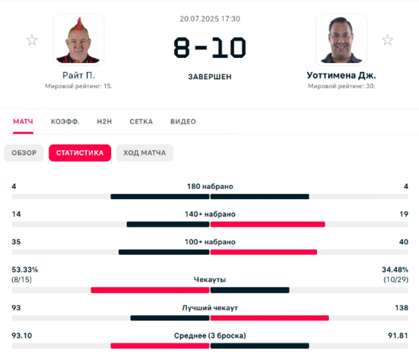 Если посмотреть только на счет, то может показаться, что была равная борьба. Увы, нет. Питер Райт в начале матча прям мучался, менял дротики несколько раз. Да это ему по ходу матча иногда помогало демонстрировать сносную игру и даже средний набор в итоге вышел неплохой, но по факту за победу шотландец не боролся. Краткий итог: Уоттимена наконец-то обыграл Райта на большой сцене, ну а Райт слегка реабилитировался своей игрой за провал на Кубке мира и выглядел под конец матча даже достойно своего уровня.