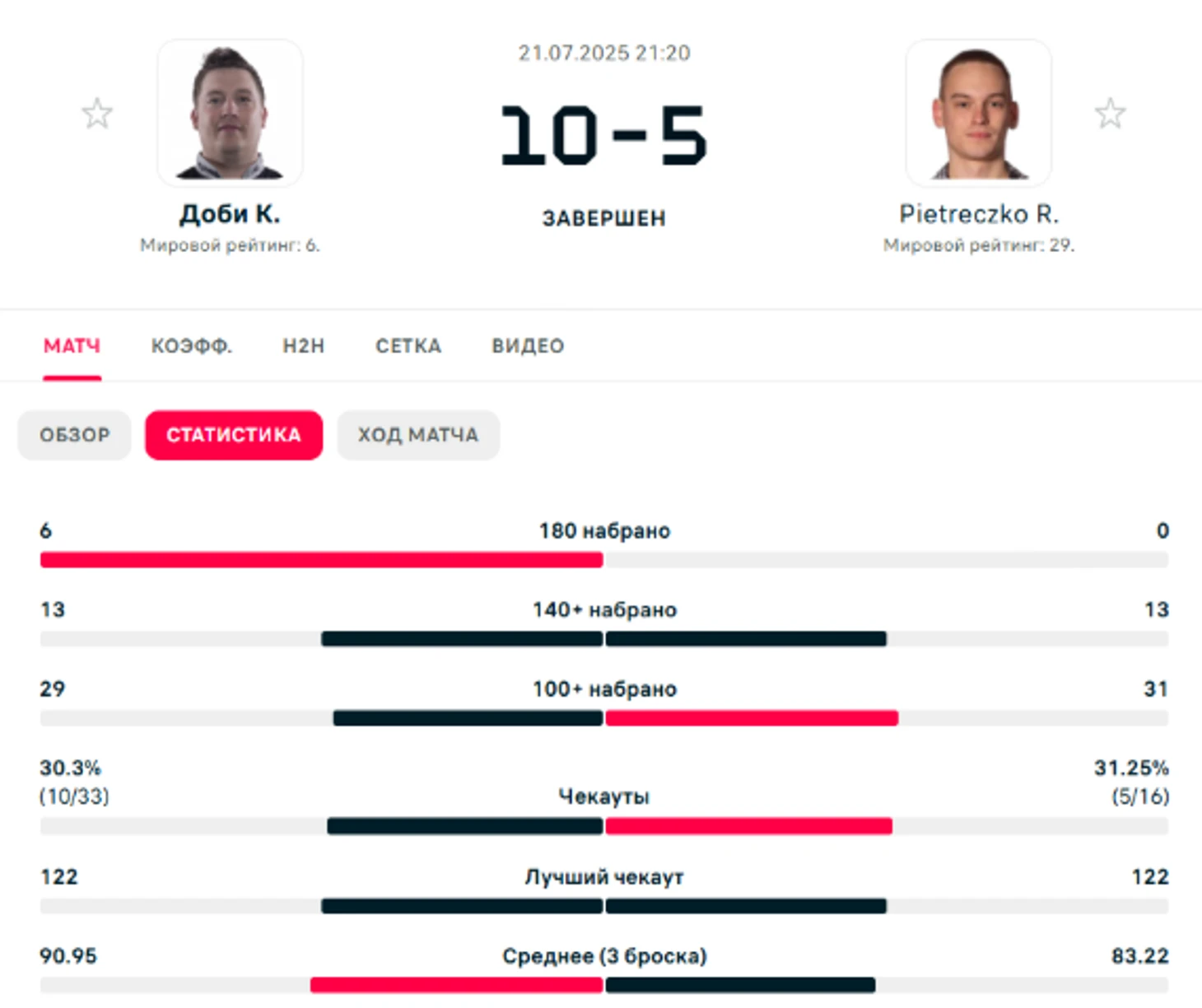 Были опасения, что эта встреча будет самой скучной на турнире. К сожалению так и вышло. Петречко только ближе к концу начал показывать набор очков под стать профессиональному дартсмену, по началу у него нелетело как надо от слова совсем. Отсутствие у немца подходов на 180 очков только подтверждают этот тезис. Доби тоже не показал индивидуального перфоманса и только больший опыт помог в такой тягучей игре англичанину взять верх.