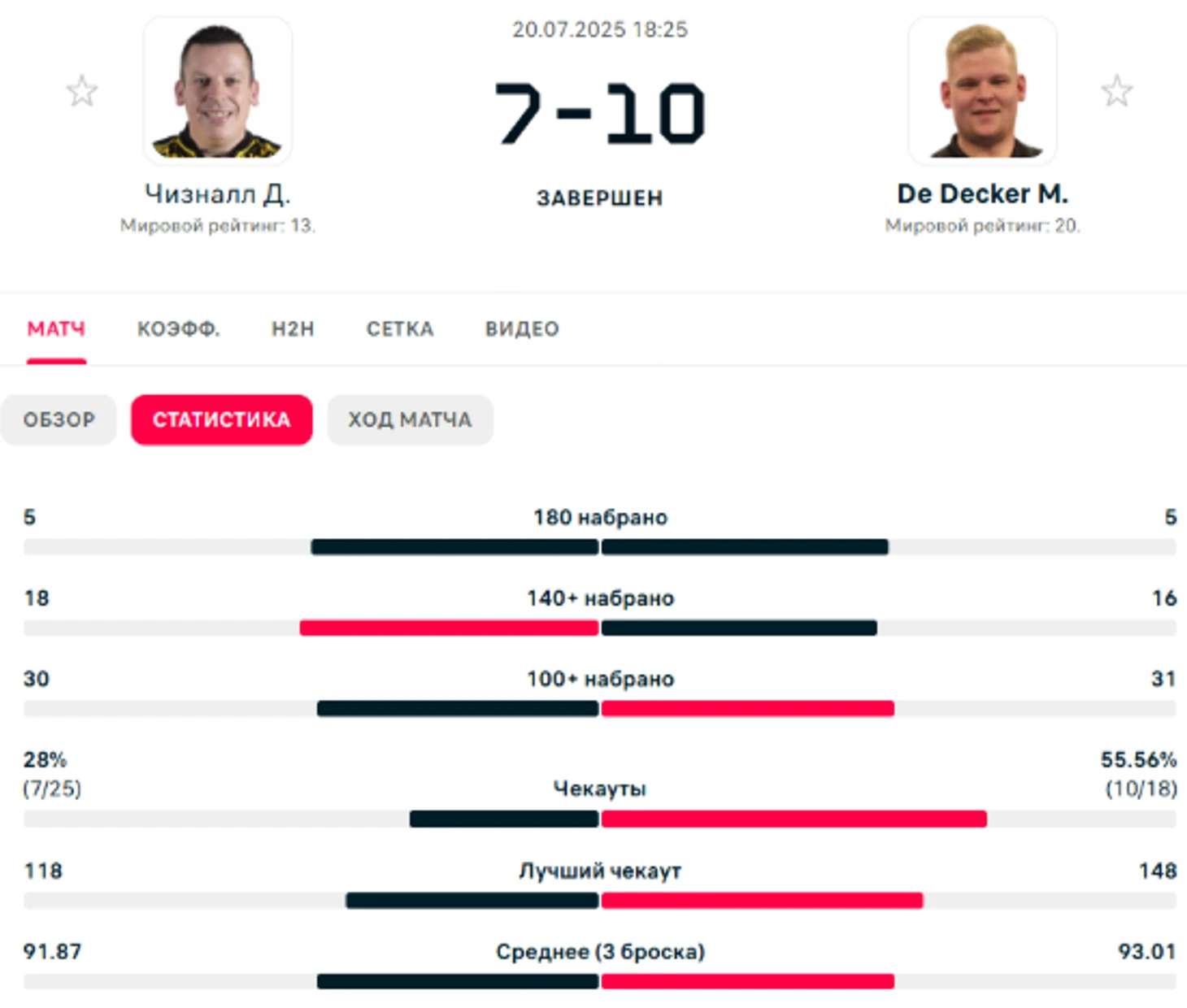 Этот матч завершал дневную сессию второго игрового дня и после насыщенных предыдущих матчей в событийности конечно уступал. Дартсмены великолепно играли на своем начале и очень отвратительно на начале соперника. Таким образом доскакав до счета 7-7 можно было во-первых уснуть, а во-вторых ожидать тай-брейк. Но де Деккер был абсолютно против такого исхода. Закрыв сначала чекаут в 104 очка, бельгиец решил в последнем лэге прикрыть 148 очков и сотворить главный момент игрового дня.