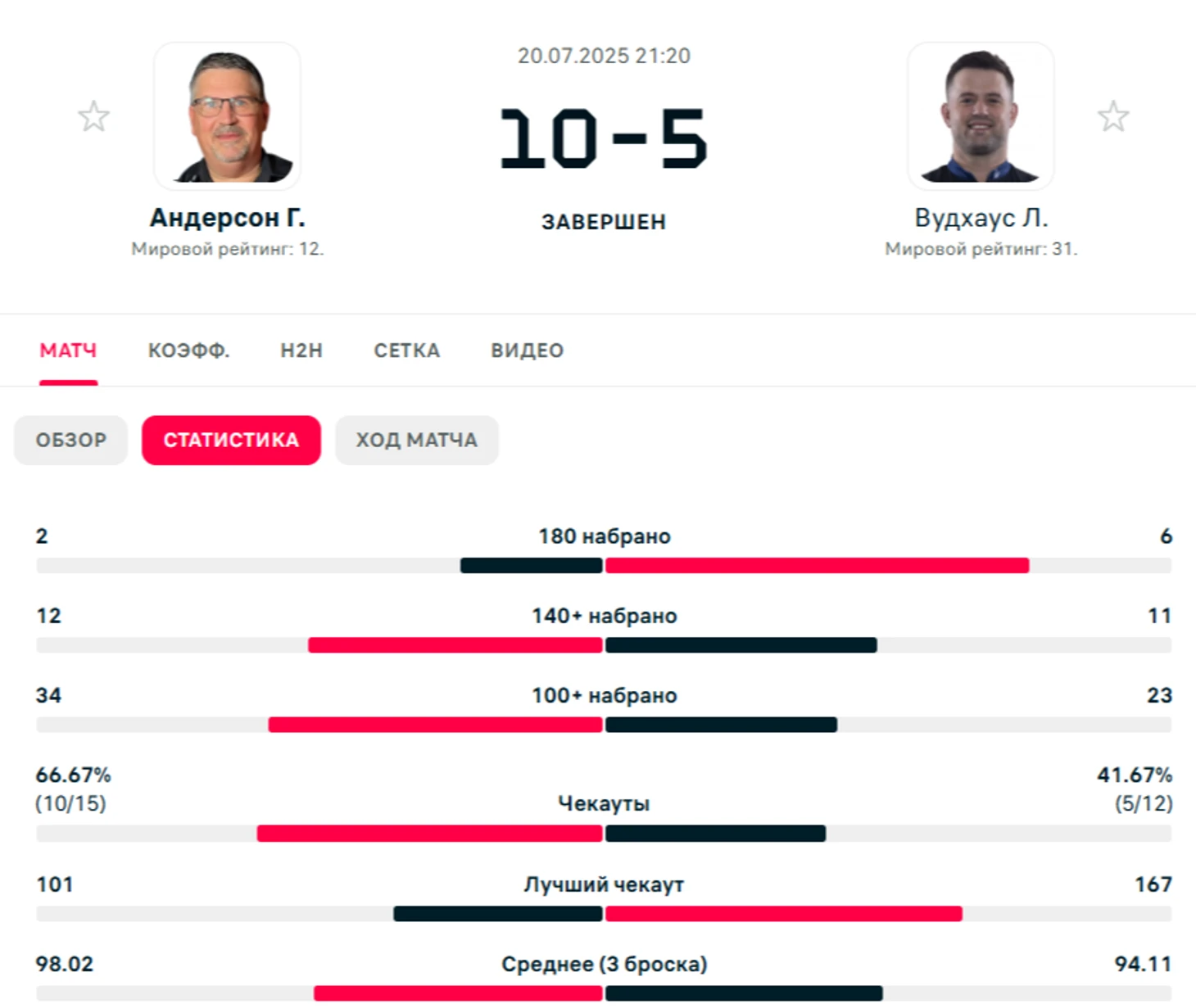 Несмотря на то, что перед этим матчем была целая серия вылетевших сеянных игроков, в Гари Андерсоне была уверенность. Вудхаус конечно начал за здравие. Первыми же бросками набрал 180 , повел в счете с преимущество в два лэга. Но шотландец сейчас получает и удовольствие от игры и все еще держится на высоком уровне. Андерсон просто начал методично и стабильно подходить к мишени и довольно быстро превратил игру в формальность. Чего он таким методичным не был на Кубке мира только, возможно Питер Райт его тогда укусил.