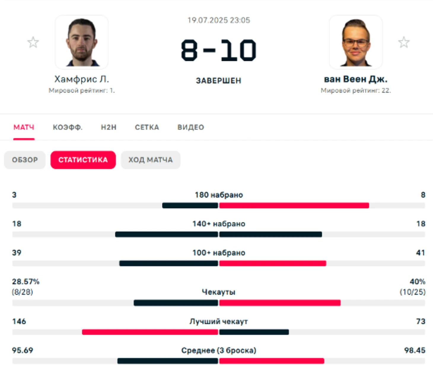 Хамфрис приехал в Блэкпул защищать прошлогодний титул , но защита вышла не очень от слова совсем. Причем лидер мирового рейтинга такое ощущение, что проиграл сам себе. Да у него было два крутых чекаута, но с самого начала матча Хамфрис ругал сам себя, был недоволен любому промаху и слишком нетипично для себя был эмоционален. Эмоции англичанина и погубили. Пока ван Веен скурпулезно был поглощен процессом игры, Хамфрис играл с некой оглядкой на свой статус и то что он своими показателями ему не соответствует. В конце вообще дошло до миниистерики , когда Хамфрис начал просто бросать лишь бы куда-нибудь попасть. В игре против соперника, чей стиль подразумевает хорошую игру на чекаутах, такое поведение экс-чемпиона мира было неким самоубийством. Отсюда и такой итог.