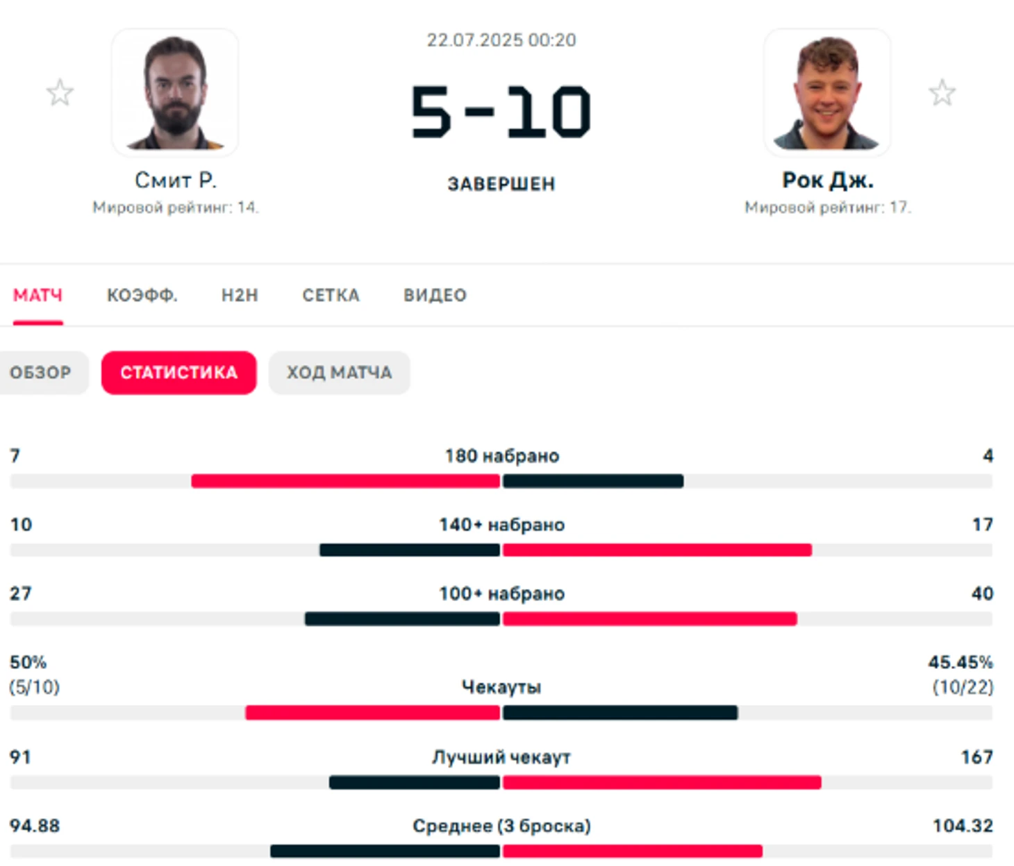 Завершался первый круг равными между собой соперниками по всем предварительным раскладам. Правда игра получилась неравнозначной. С самого начала у Росса Смита она не пошла и при столь мощной игре Джоша Рока шансов у англичанина не было. Уже на третьем лэге Рок сделал чекаут в 167 очков и тут все и стало понятно. Таким образом Рок реваншнулся за прошлый год и своей игрой показал, что в своей части турнирной сетки он фаворит. Потенциал у ирландца всем известен, осталось только его подтвердить.