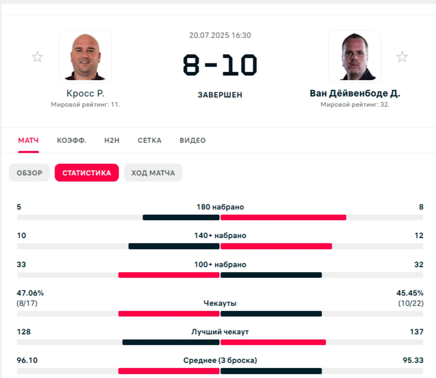 Роб Кросс пополнил список сеянных, вылетевших на первом этапе. Но в отличие от Аспиналла и Хеты его скорее можно отправить к Хамфрису в группу тех, кто просто потерял игру. Начиналось для чемпиона мира 2018 года очень даже все хорошо. Кросс вел в счете 6-2 и казалось все прошлые проблемы ушли. Но голландец собрался. Обычно на Матчплее можно отыграться во время рекламных пауз, но ван Дейвенбоде смог это сделать прям по ходу матча. уже при счете 7-7 было понятно, что сегодня Кросс врядли победит, да он по инерции взял еще один лэг, но он сам как будто все понял задолго до окончания матча. Еще один неубедительный турнир у англичанина и когда он преодолеет этот кризис непонятно, но очень интересно.