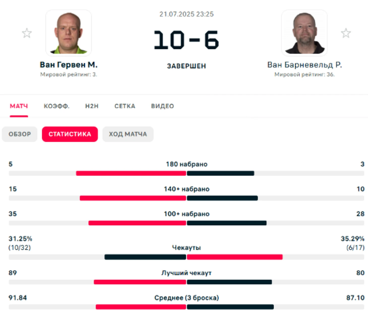 Легендарное противостояние двух голландцев прошло не шибко эффектным. По глазам ван Барневельда видно, что ветеран уже не получает того удовольствия от игры как раньше. Попал значит попал, не попал, ну подумаешь сколько раз я за 40 лет карьеры не попадал. Именно такие мысли как будто посещают Барни. По ван Гервену непонятно насколько он сейчас хорош и какие у него перспективы на турнире, но по крайней мере его рвение закрывать большие чекауты показывает, что на хороший результат он заряжен и не хочет , чтоб этот турнир был для него проходным.